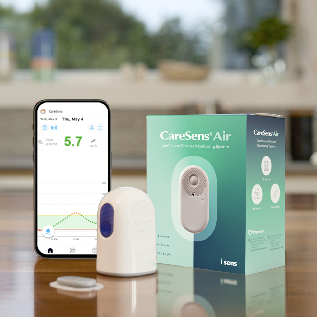 CareSens Air continuous glucose monitoring system is for diabetes mellitus (type 1,2) management in people aged 18 years and over. If current sensor readings or alerts do not match symptoms or expectations, use a blood glucose meter to make treatment decisions. A compatible smart device is required.