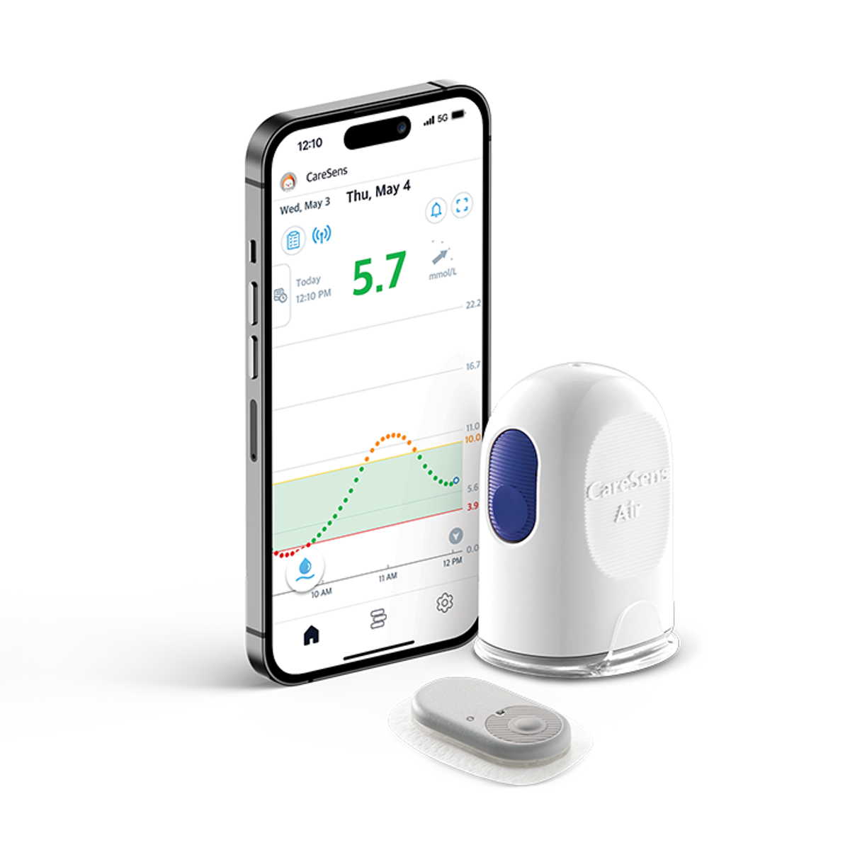 CareSens Air continuous glucose monitoring system is for diabetes mellitus (type 1,2) management in people aged 18 years and over. If current sensor readings or alerts do not match symptoms or expectations, use a blood glucose meter to make treatment decisions. A compatible smart device is required.